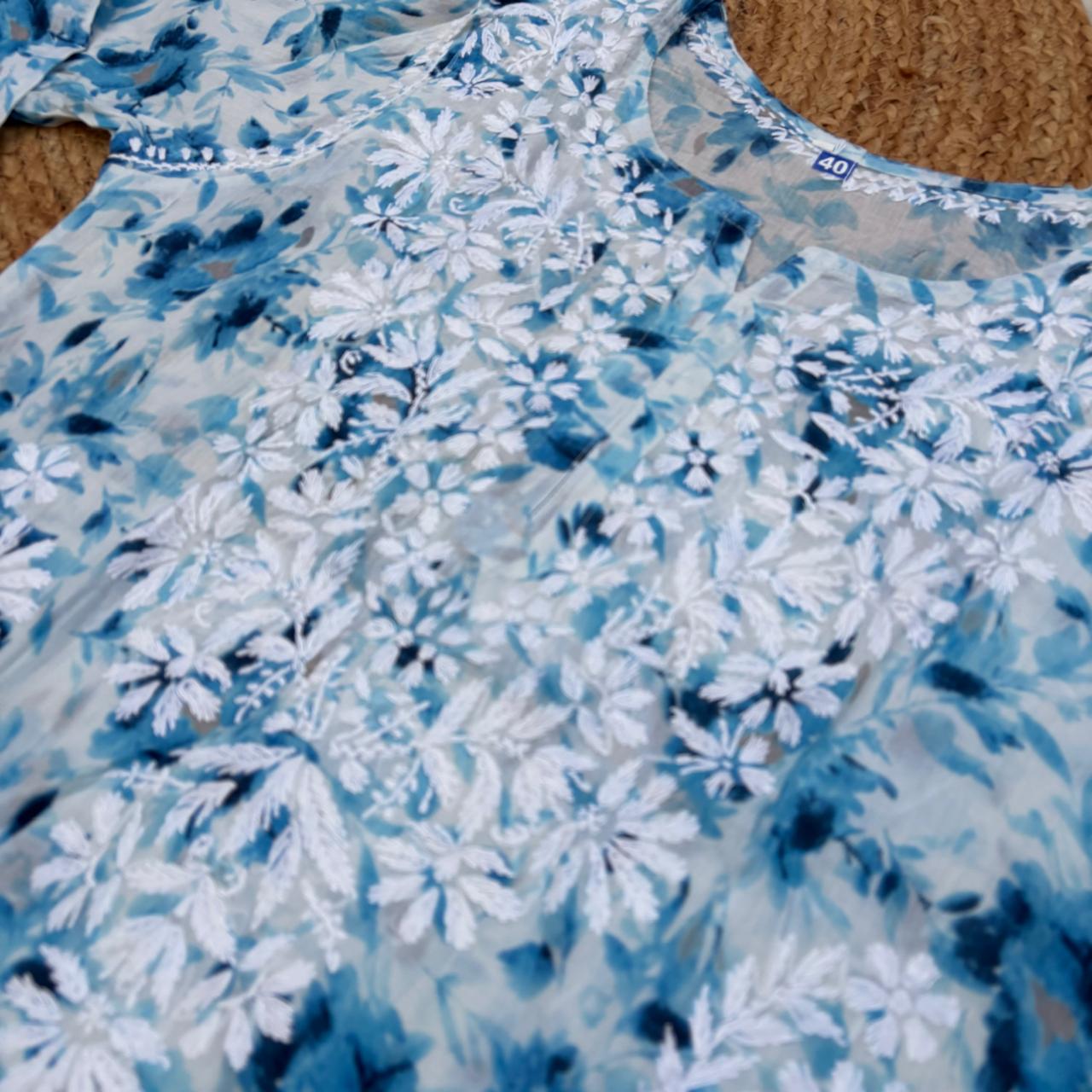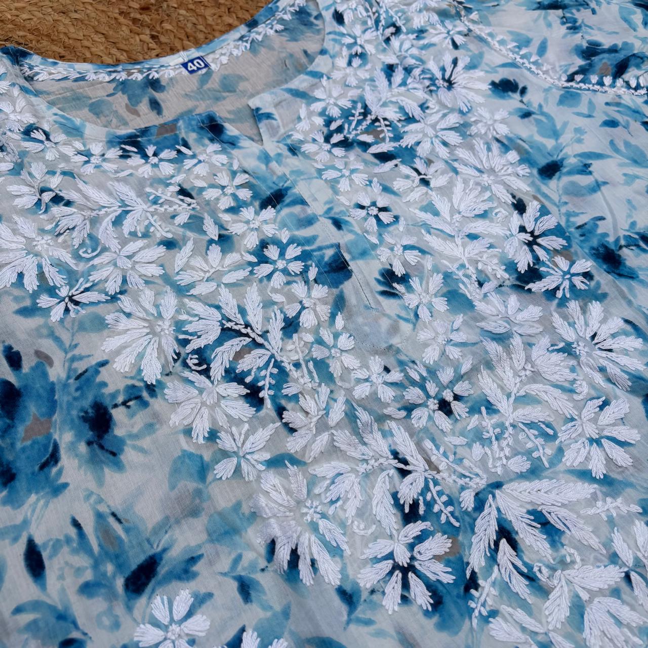 Amara Pure Mulmul Chikankari Handwork Kurti -Blue Colour