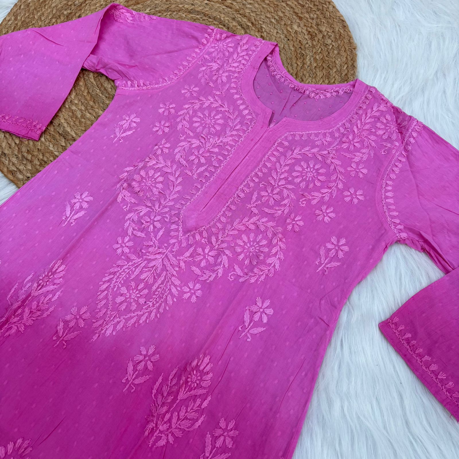 Tuba Ombre Shaded Dobby Cotton Chikankari Kurti - Pink Colour