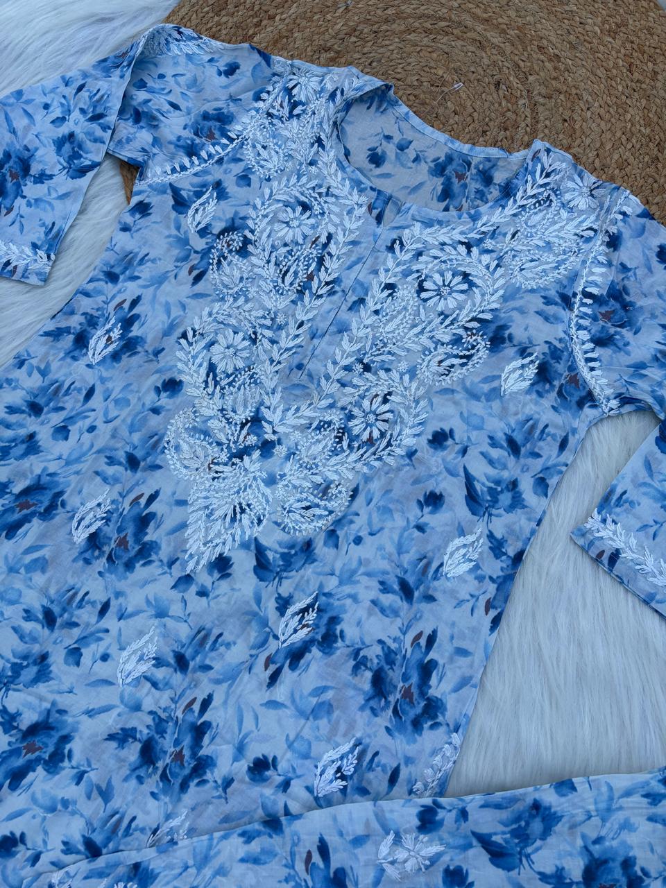 Hadaya Mulmul Cotton Chikankari Kurti Set - Blue Colour
