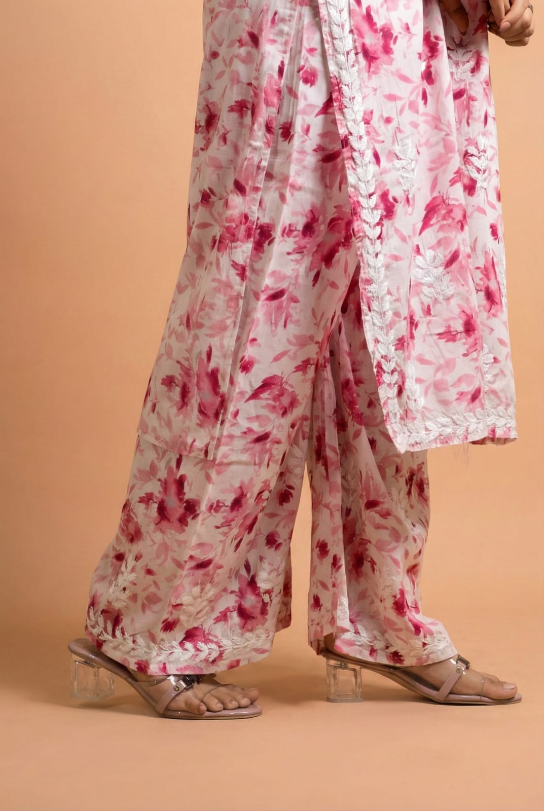 Aaliyah Mulmul Cotton Chikankari Kurti Set - Pink Colour