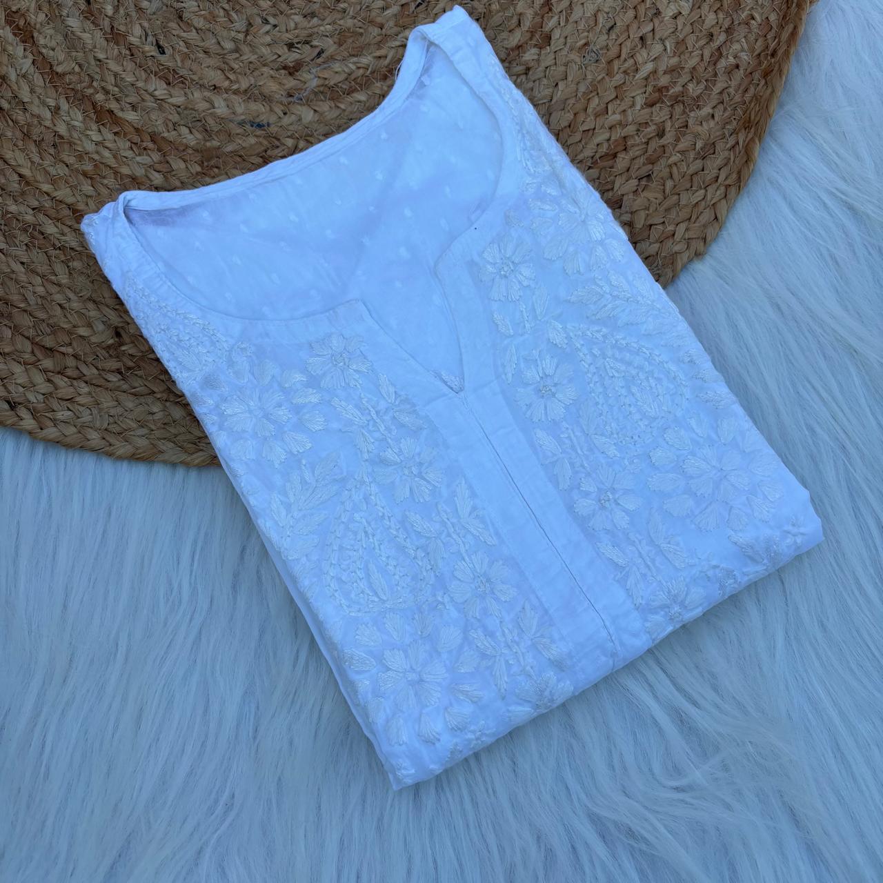 Vani Dobby Cotton Chikankari Kurti - White Colour