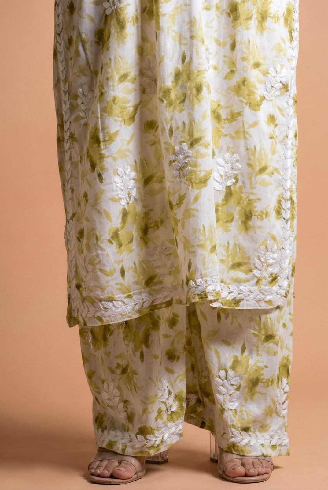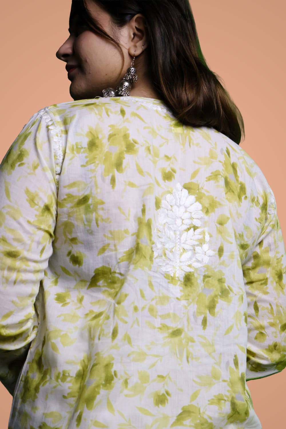 Aaliyah Mulmul Cotton Chikankari Kurti Set -Green Colour