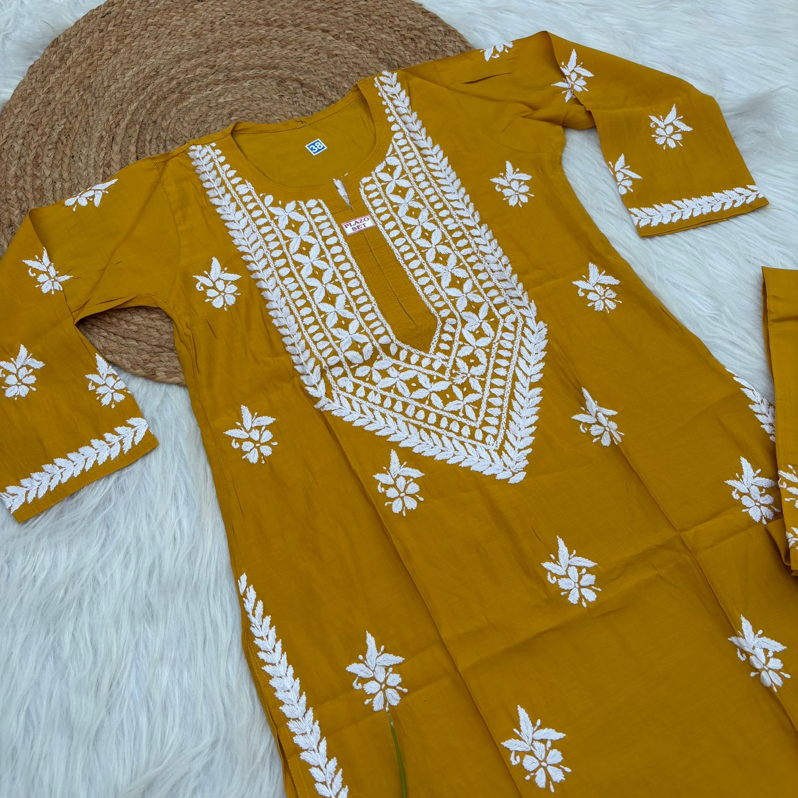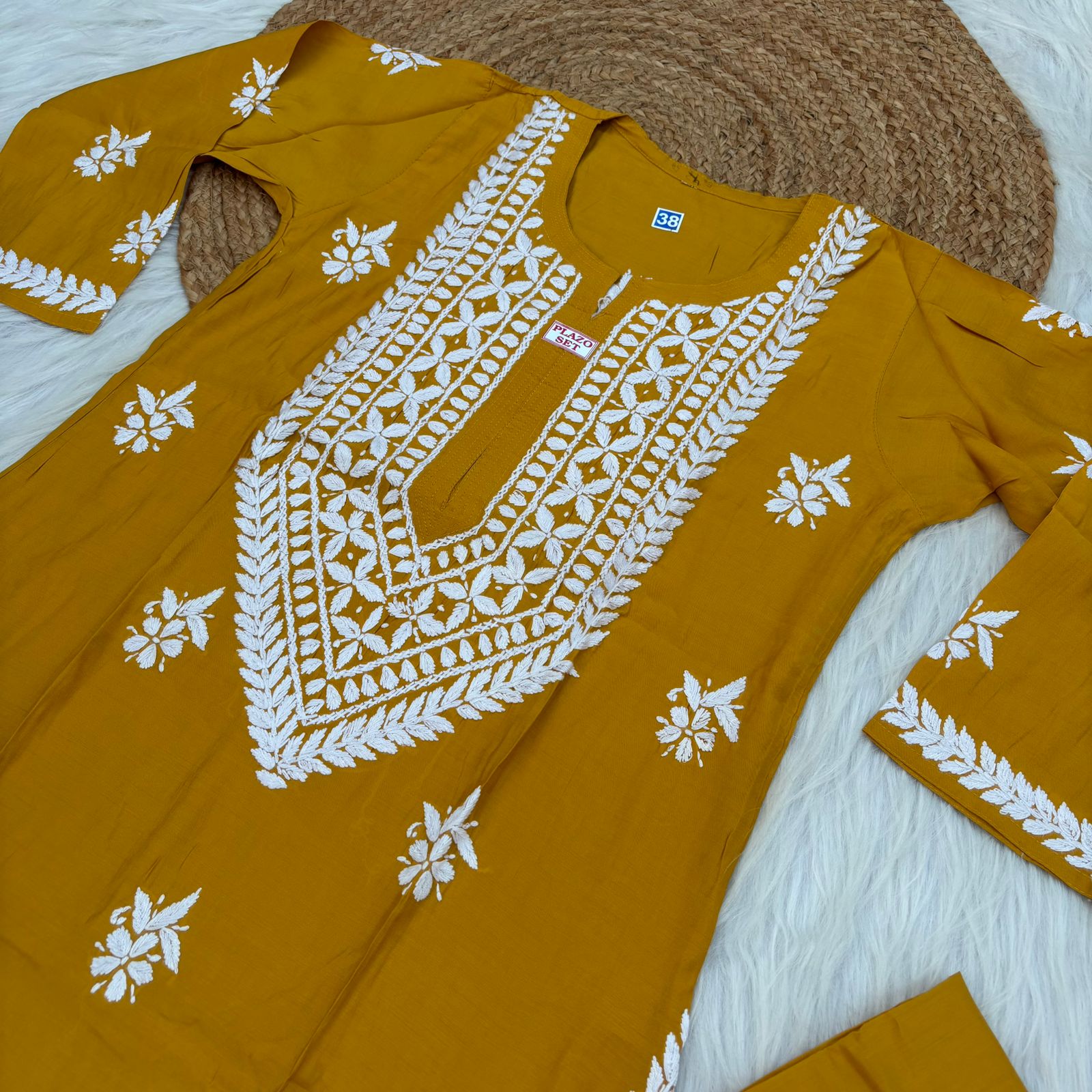 Afana Silk Chikankari Kurti Plazo set Yellow Colour