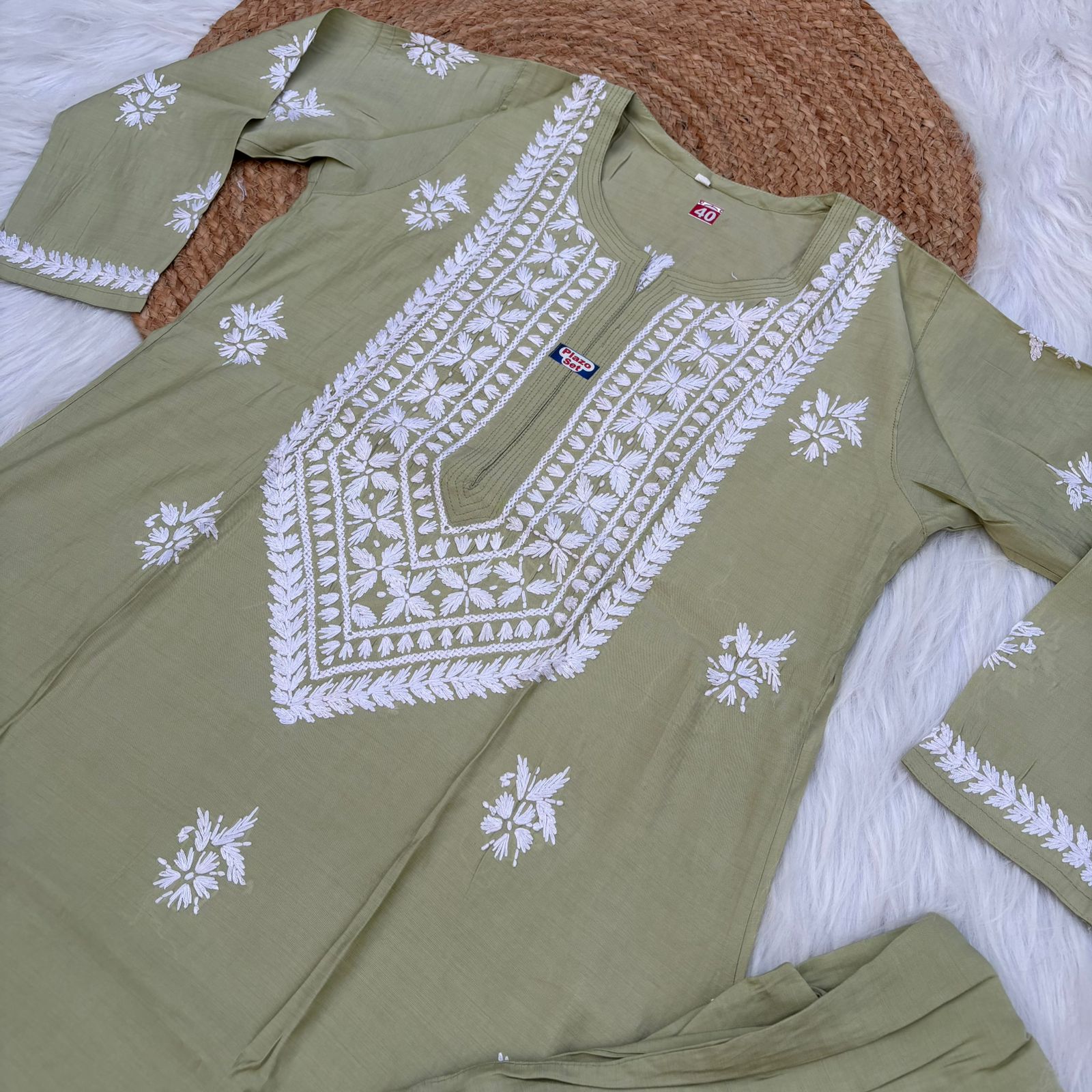 Afana Silk Chikankari Kurti Plazo set Pista Colour