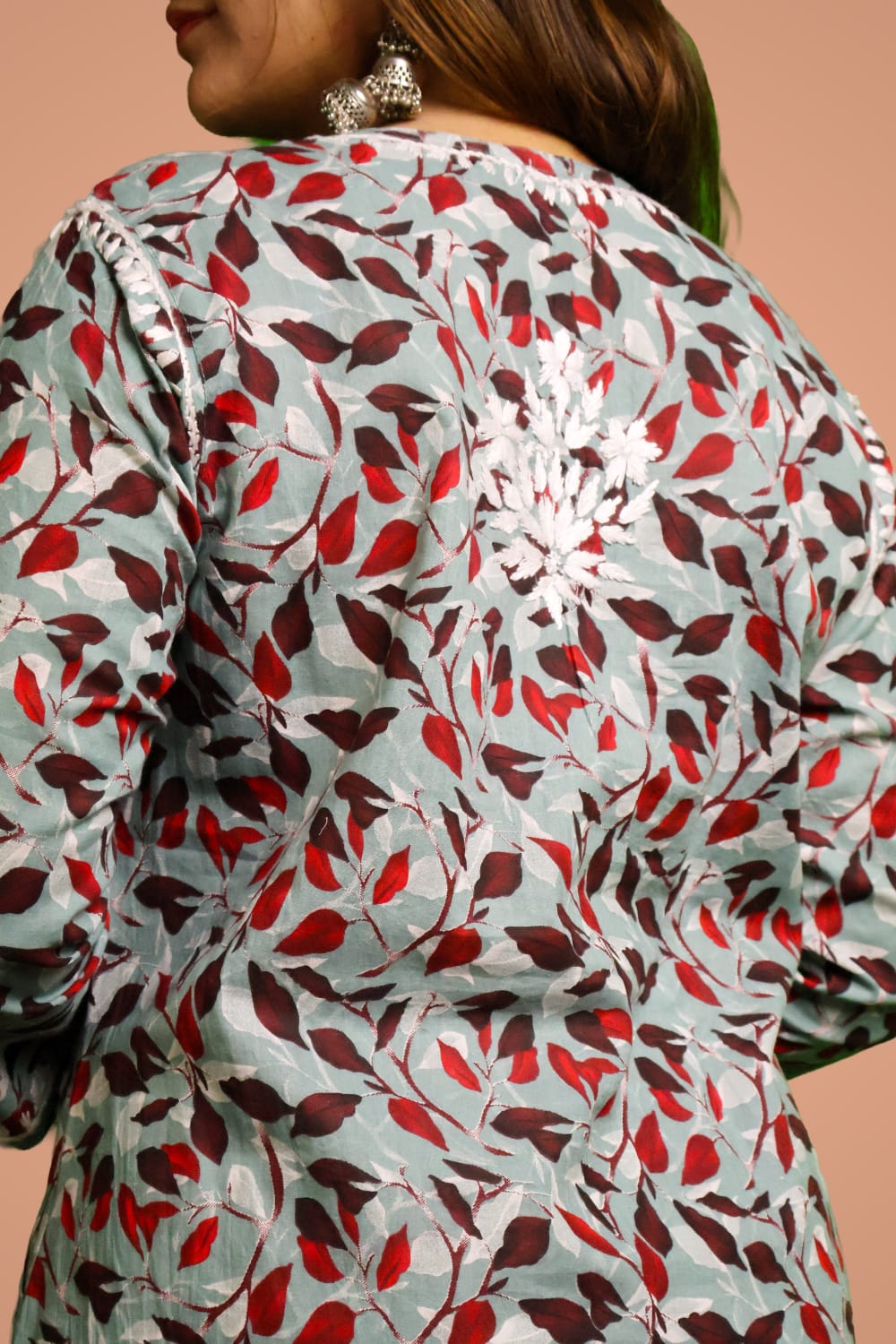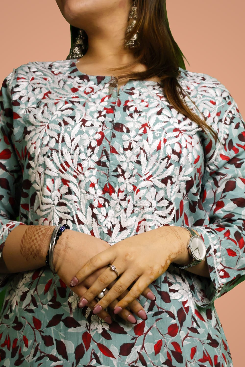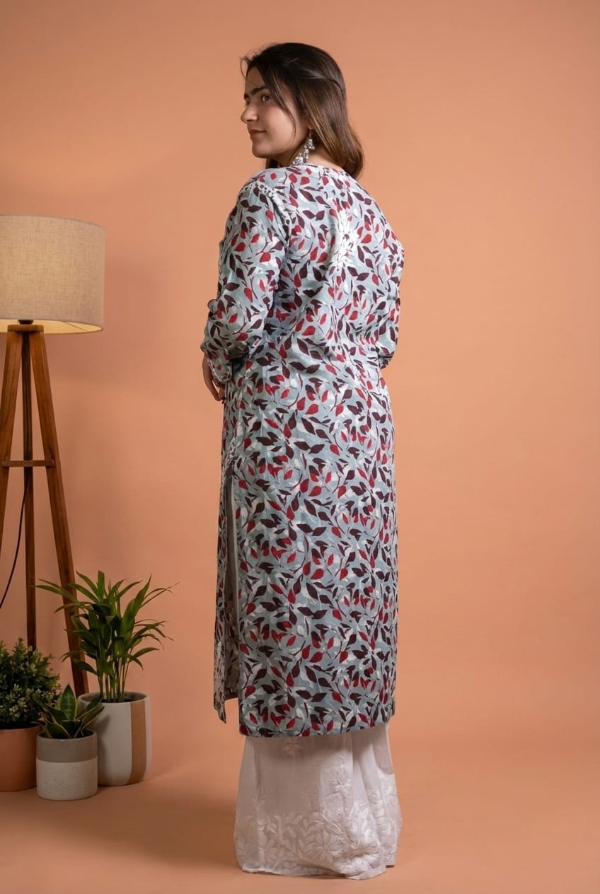 It's perfect for casual outings and can be dressed up or down effortlessly. With its comfort and aesthetic appeal, this floral-printed Mulmul Chikankari Kurti is a must-have for fashion-forward individuals.