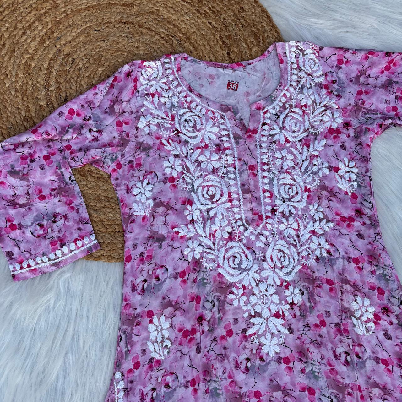 Hina Rayon Rose work Lucknowi Chikankari kurti -Pink Colour