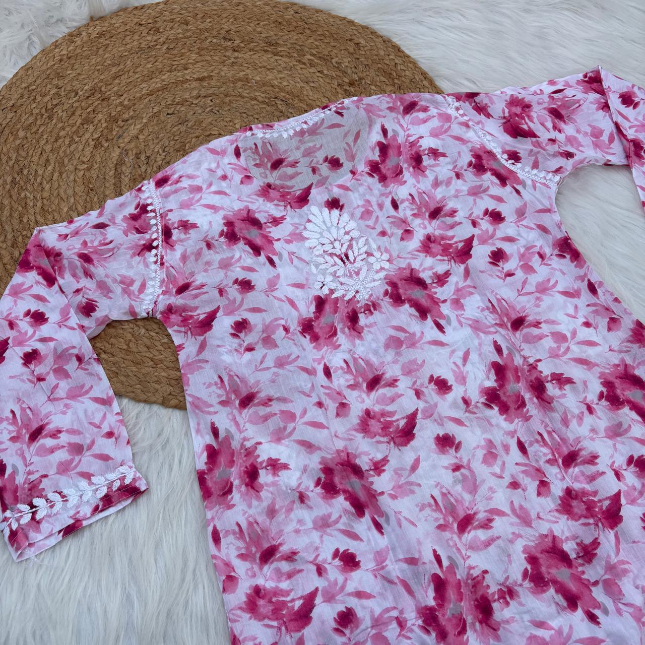 Aaliyah Mulmul Cotton Chikankari Kurti Set - Pink Colour