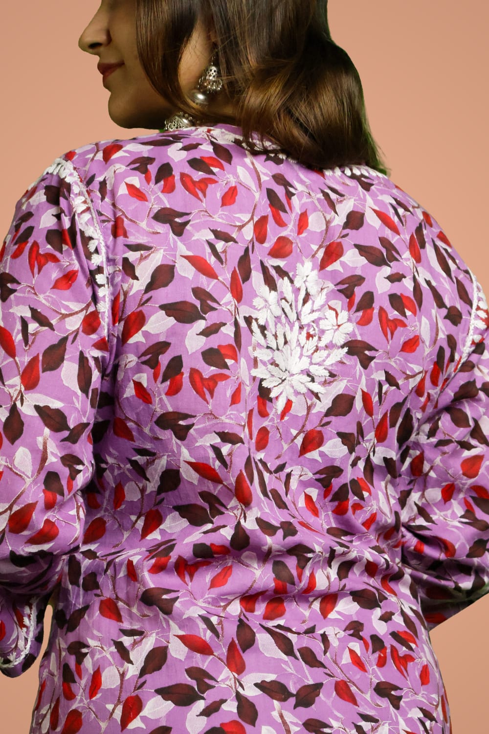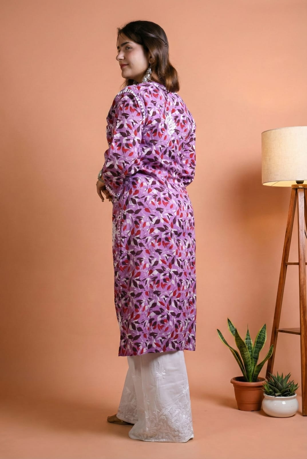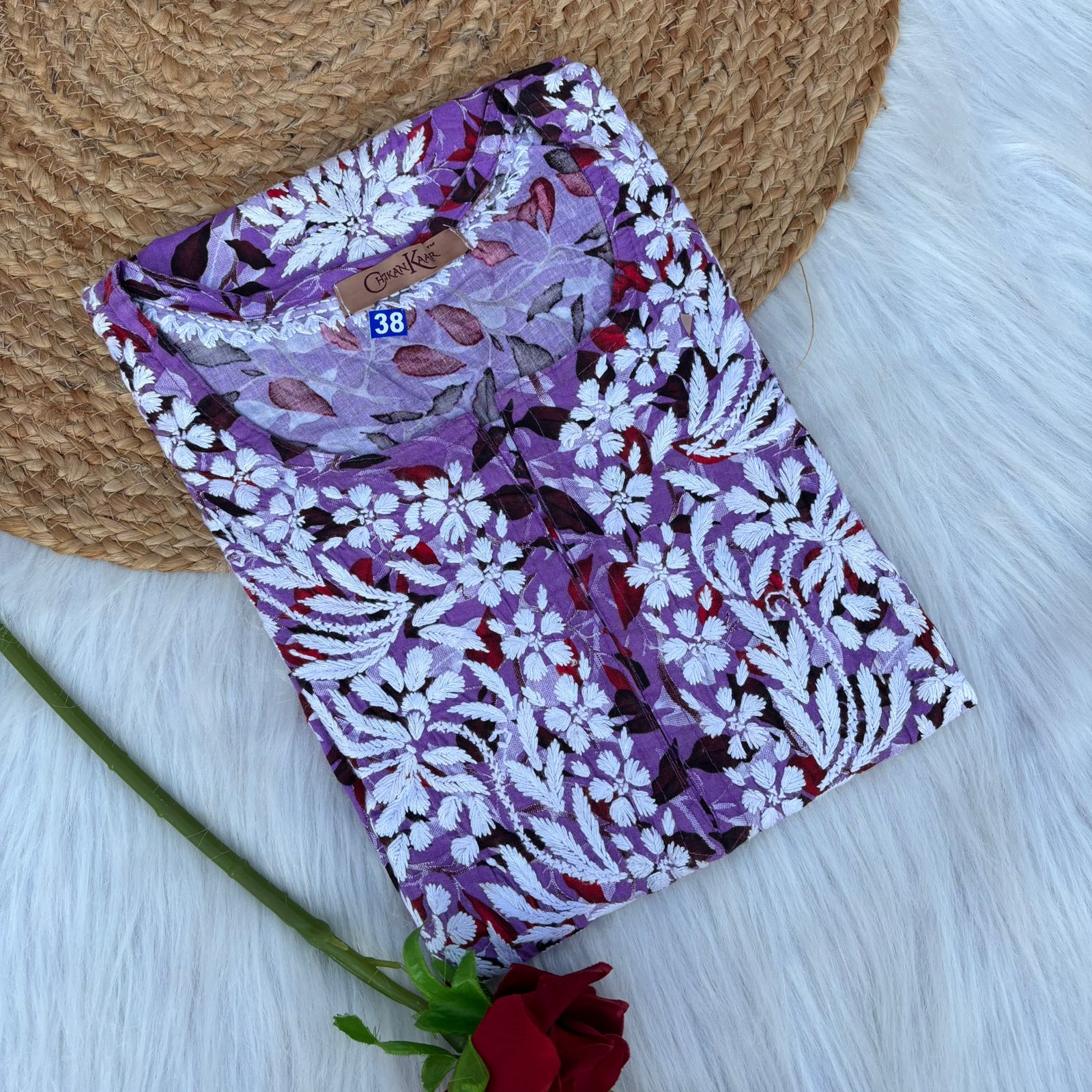 It's perfect for casual outings and can be dressed up or down effortlessly. With its comfort and aesthetic appeal, this floral-printed Mulmul Chikankari Kurti is a must-have for fashion-forward individuals.