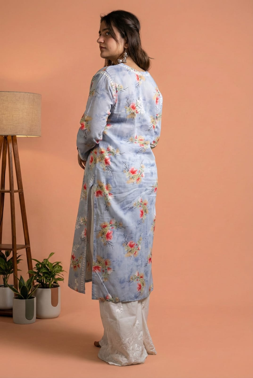 It's perfect for casual outings and can be dressed up or down effortlessly. With its comfort and aesthetic appeal, this floral-printed Mulmul Chikankari Kurti is a must-have for fashion-forward individuals.