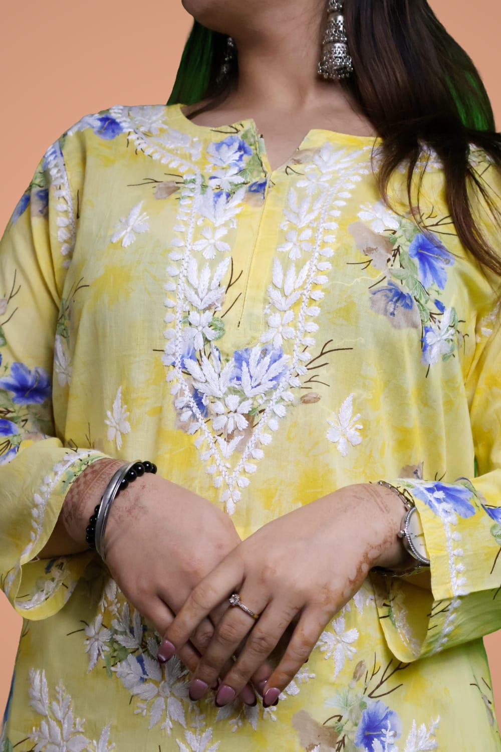 It's perfect for casual outings and can be dressed up or down effortlessly. With its comfort and aesthetic appeal, this floral-printed Mulmul Chikankari Kurti is a must-have for fashion-forward individuals.